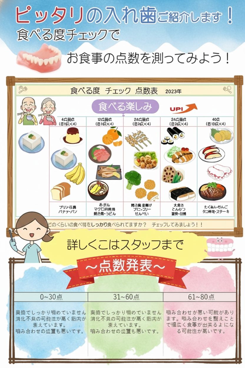 近藤義歯研究所オリジナルの「食べる度チェック表」を使用し、これまでの入れ歯でのご苦労や、実現したい希望について詳しくお伺いします。
