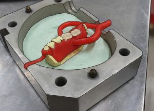 仮合わせで調整したロウの部分を、最終的な歯ぐき部分の材料であるレジン(プラスチック)に置き換える作業(重合)に入ります。