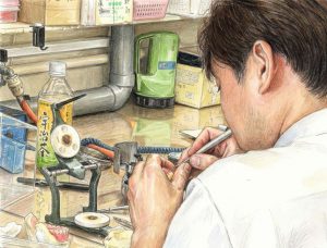 当時、新幹線に乗ったこともなく、10数年間ラボ(技工所)にこもりきりで仕事をしていた私が、名古屋へ行き、遠山社長に直談判。咬合器は認められ、市販化に向けて動き出しました。